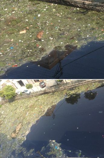 从图片上看河水已经发黑,河面上还漂浮着一层厚厚的绿色污垢,夹杂着不少垃圾。