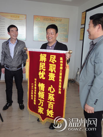 温州讯温州时代华庭花园251户业主十年未领到土地证事件近日画上圆满的句号(详见《奔波9年拿不到土地证温州时代华庭业主很苦恼》)。4月19日下午,时代华庭的业主代表们特地给国土资源局龙湾分局送去锦旗表示感谢。