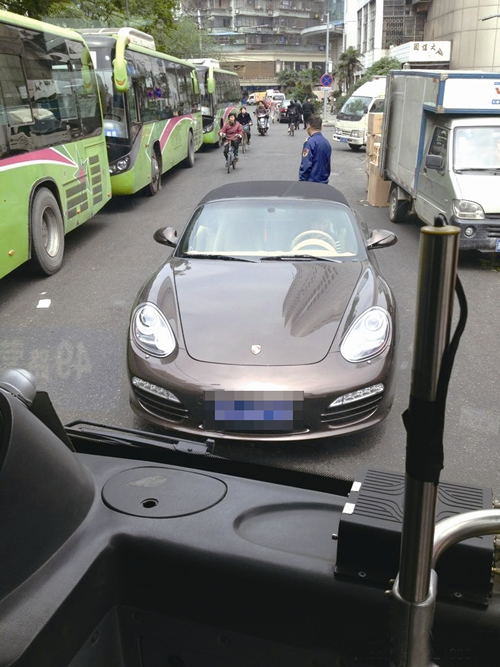 提起顶牛,当事的公交车司机张师傅还是有些生气。他说,当时他刚要发车,一调头,就发现车前开来一辆棕色的保时捷私家车,他按喇叭让其离开,但车中的女司机没有理睬。因为那里只有一个双向行车道,另一个车道已经被公交车占满,所以双方顶在了路上。他只好下车与对方沟通。