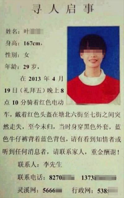 温州网4月23日讯(记者戴玮)4月20日,新浪微博上出现了一则寻人启事:叶某某,29岁,4月19日晚上8点在温州苍南灵溪五街塘北路到阿齐美食城这里失踪,手机联系不上,家里人十分着急。该博主还称失踪的姑娘是一个七岁娃娃的母亲,同时附上了寻人启事的文字和真人照片。