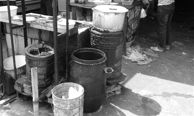 在鹿城工业区环球路一无证餐饮聚集点,6家小餐饮店横排铺开,摆在店外的水桶、煤气灶等用具已经被油垢覆盖得完全看不出原来的底色,黑漆漆黏糊糊,令人不敢靠近。记者还注意到,有些店面甚至未接通自来水,食品清洁度难以保证。执法人员告诉记者,环境恶劣、操作流程不规范、没有消毒设施,是这里店家的通病。该经营点因卫生环境恶劣、违章危房搭建严重成为创卫工作的“顽疾”。