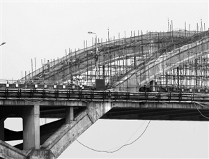 桥拱处搭建了脚手架护栏,有工人在施工。赵用摄