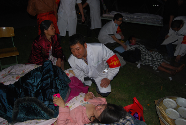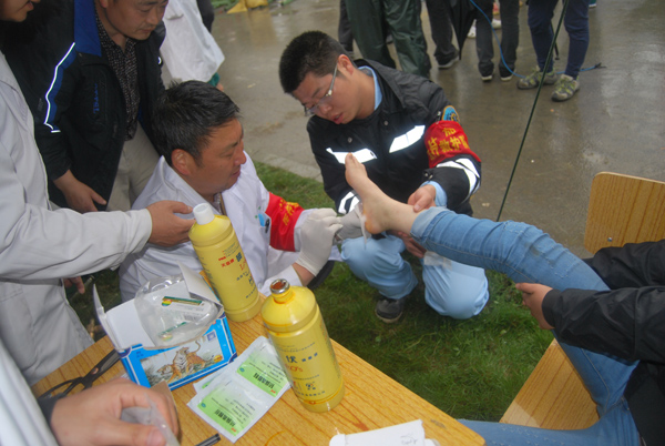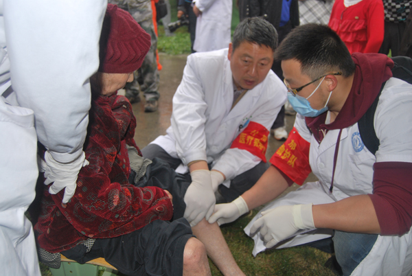 20日早上9点,接到支援雅安的命令,很多人要求参加。最后,他们组成了一支由41名医护人员和4台车辆组成的队伍,马不停蹄赶往雅安。“真的是在和时间赛跑,心中就是想到那些等待救援的生命。下午6点40分,他们终于到达灵关镇,来不及安顿,就开始给伤员医治。