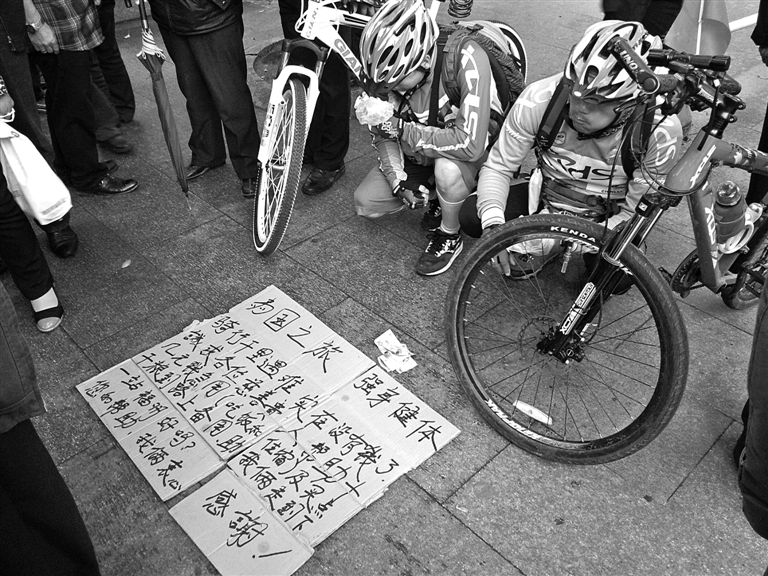 记者在未表明身份时,问他们骑行行程如何安排?为什么不打电话向家人要钱?没食宿为什么不去打工或求助救助站?一名男子说,出门靠朋友嘛。当记者表明身份,对方马上撕掉纸板,骑车离去。记者张新彤/文王诚/摄