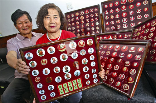 温州网讯昨天,正在搬家的钱履根老人和老伴,找出了两人共同收藏的350枚毛主席像章,这是两人46年婚姻的见证,他们打算在新家中专门腾出一面墙来悬挂。两位老人是在上海当兵时相识的,均有收藏毛主席像章的爱好,1967年结婚后,两人通过各种途径收集不同样式的毛主席像章。记者王诚/摄