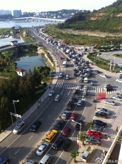 从昨天上午起,关于洞头交通拥堵的话题不断出现在微博上。图为网友上传微博的洞头岛上的拥堵照。请作者联系本报索取稿费。