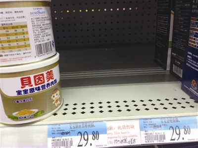 沃尔玛东海店的货架上,贝因美金枪鱼鱼酥、旗鱼鱼酥贴着“缺货”标志。卢静摄