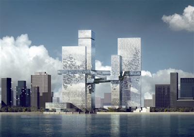 由于地块本身被市政道路与天然河流分割成四个部分,导致在设计过程中必须要同时面对复杂的多方面限制。设计师们在充分分析了建筑体量和建筑高度对三江半岛滨江天际线的整体影响之后,分别给出了他们眼中的“国际级”。他们的作品,有的创造性地利用了“穿越手法”,有的则是采用了生动的“叠加艺术”,有的通过魔术般的空间设计手法营造出了城市公共广场,有的仿佛让我们置身于现实版的“盗梦空间”中。
