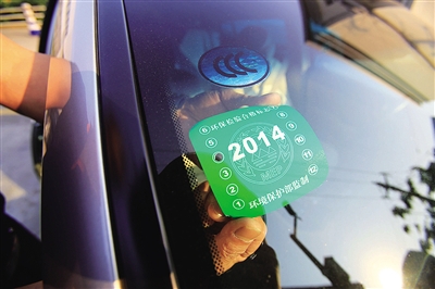 一车主在车辆年审合格后贴上环保“绿标”。刘伟摄