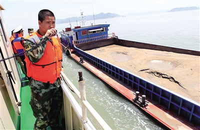 当天中午,温州海警二大队出动海警33022艇,配合温州海事局洞头海事处执法人员对洞头海域进行巡查。在状元岙码头附近海域,执法人员要求一艘名为“行运080”的内河船停航并接受检查。记者看到,这艘船上装了满满的海砂,有1000多方(约合1600吨)。据船主刘某说,他们是去年9月从上海过来的,“一趟下来能赚个几千元,所以老板有招呼,我们就过来了。”
