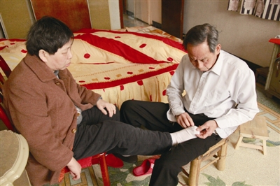 每天上午7点,注射胰岛素,准备早饭,10点买菜,10点半推拿,下午5点再次注射,这是老张近两年的日程。他几乎成了妻子的家庭医师兼保姆。“我家保姆都换了四五个了,就我一个雷打不动。”