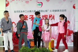 近日,永中二小举办了第八届“美丽心情”心理健康活动月暨“心乐园”成立十周年庆祝活动之全市参观日活动。常态活动、特色活动和参观活动三大板块精彩纷呈。据悉,永中二小是我区唯一一所向全市开放心理健康教育活动的学校。图为家长和子女一起表演亲子心理剧。