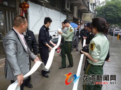 随后主要围绕巡防大队队员如何在社区突发紧急事件中第一时间开展救援,以及物业公司如何尽快疏散群众,保证居民生命财产安全工作进行实地演练和传授了常用的灭火方法,分别介绍了如何使用灭火器、消火栓、水带等灭火器具。