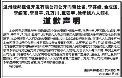 道歉者是一家房产商——温州峰邦建设开发有限公司(以下简称“峰邦公司”),道歉对象是苍南县龙港镇方岩村的蒋仕省、李其峰等8位村民。