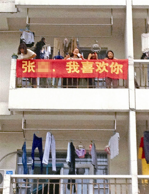 表白的女生是大三学生。她说,喜欢这名张姓男生已近两年,为了不让自己的青春留有遗憾,所以鼓起勇气挂出横幅表白,把这份心意说出来。横幅挂出不久就被取下,是因为该男生说已知晓对方心意,希望她先将横幅取下。