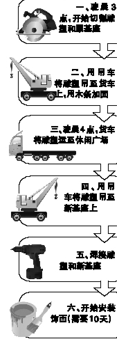 铜雕系空心锻铜,重约2吨。为顺利将其移走,各方作了相当周密的考虑。据施工方负责人麻先生介绍说,所有工人和车辆凌晨3点抵达现场开始动工。“先敲掉原基座,切割底部钢板,再通过吊车将铜雕移至货车上,用木板固定后运至休闲广场,再吊至新基座上,然后焊接接合处,整个过程持续约3小时。”此后,还需进行约十天的外立面装饰。