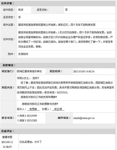 4个月拿不到购房发票 市民投诉区长信箱得神回复