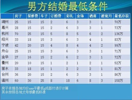 据中国宁波网官方微博消息:网友@小天很无聊在微博上贴出一张“男方结婚最低条件”表称,温州老婆娶不起,还是娶个衢州妹子好。表格显示,房价是依据各地均价100平最低三成首付进行计算,其余各项则按照各地丈母娘提出的最低标准计算。小编点评:别太当真,权当轻松一下。