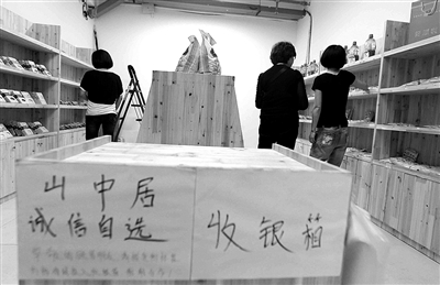 前天上午,记者来到“山中居诚信自选”。它有两家店铺,分别位于信河街地下通道的8号和13号。每个店铺约10平方米左右,布置简约,两边各立着一个三四层高的木制货架,上面摆着琳琅满目的绿色食品和进口食品,有红枣、燕麦、五谷杂粮、咖啡、巧克力、饮料等。店前的收银箱上贴着一张白纸,上面写道:“尊敬的顾客朋友,请按货物标签价格将钱投入收银箱,谢谢!”
