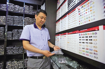 徐建清平时常到钮扣城的商铺里转转,看看各家的钮扣陈列。刘伟摄
