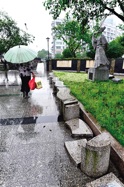 5月7日记者在市区西山东路滨水公园发现,叶适像附近的石凳断裂。