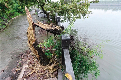 南湖塘河休闲公园里,一些树木开膛破肚。杨冰杰摄