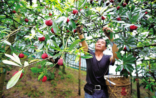 温州日报讯 日前,在龙湾区状元街道大岙溪杜溪杨梅专业合作社大棚内,一工人在采摘刚成熟的杨梅。据悉,该合作社500多亩大棚杨梅已基本成熟,不过因为刚上市,价格并不便宜。刘伟王策摄