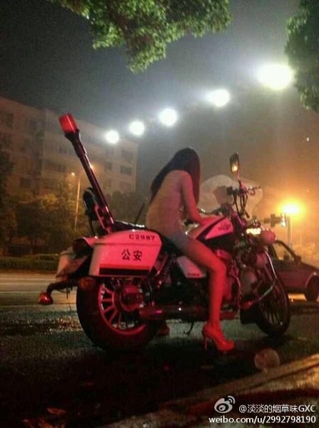 5月27日23时46分许,网友“@淡淡的烟草味GXC”在微博上贴出一张照片,当天夜晚,温州一个披长发、穿短裤、高跟鞋的年轻女子坐在停靠路边的警用摩托车上玩手机。这名网友在微博上称:“看看这公车,还真拉风。”随后,该照片在网络上被频转、热议。