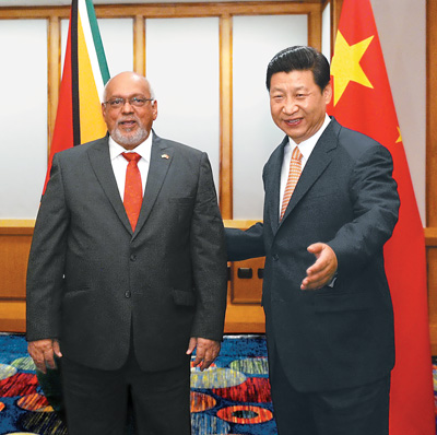 6月2日,国家主席习近平在特立尼达和多巴哥首都西班牙港会见圭亚那总统拉莫塔尔。 |
