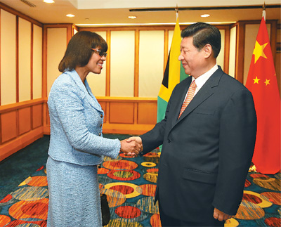 在会见辛普森—米勒时,习近平表示,牙买加是加勒比地区大国,也是中国在本地区最重要合作伙伴之一。双方可以加强基础设施建设、农业、通信、矿产等领域合作。4年前我访问牙买加时,深切感受到牙买加人民对中国文化的喜爱。中国人民对牙买加优秀田径运动员也很熟悉。双方可以加强文化、教育、体育、旅游等方面交流合作。