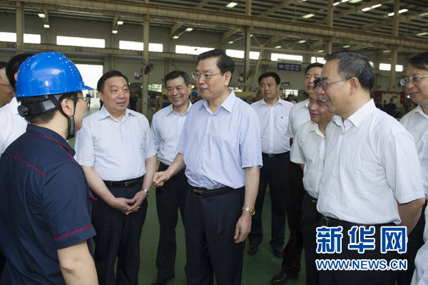 5月31日,张德江在广州广日集团电梯生产车间同工人亲切交流。 新华社记者 黄敬文摄