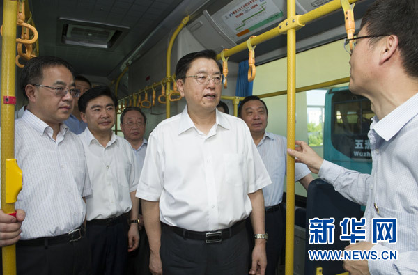 6月1日,张德江在深圳福田交通枢纽公交加电站,考察电动汽车推广应用情况。 新华社记者 黄敬文摄