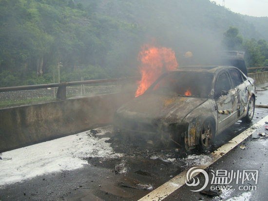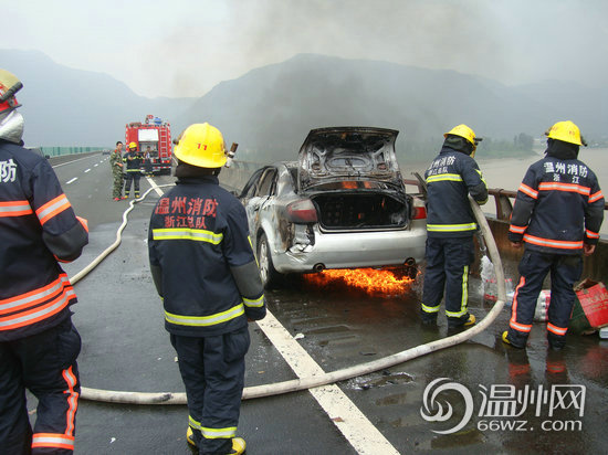 温州网6月3日讯(记者林振将通讯员徐锦书魏乐昶)6月03日下午13时许,诸永高速往杭州方向219公里处(刚进入诸永高速4公里)有一辆小车起火,高速交警接到报警后,迅速赶到现场,只见一辆台州牌照的银色奥迪A4轿车停在硬路肩上,大半个车身已被大火包围,不多久,消防部门也赶到现场,处于安全考虑,交警在火灾现场后方临时采取了交通管制。
