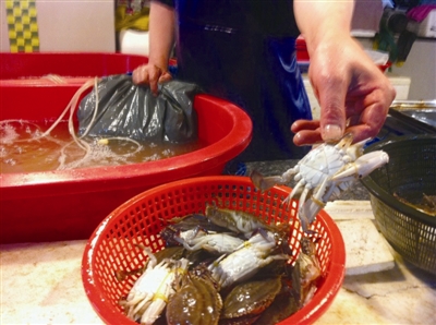 商户张先生专门为市区餐饮酒店供应江蟹。昨天早上,他靠“老关系”从市区农贸市场拿了60来斤活的白膏江蟹,“禁渔期到了,这两天市场上江蟹的供货量明显不足,要不是靠我长期从他们那里批发的‘老关系’,这批货还真拿不过来”。
