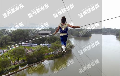昨天,2013中国(温州)世界吉尼斯走钢丝争霸赛开幕,新疆男子艾斯凯尔在市区江心屿上空走钢丝时即兴表演。艾斯凯尔将在7日和来自意大利的泽瓦塔、韩国的权元泰展开空中竞赛,冲击新的百米世界吉尼斯纪录。记者 郑之越/摄