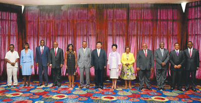 6月2日,正在对特立尼达和多巴哥进行国事访问的国家主席习近平在西班牙港为加勒比国家领导人举行午宴。这是午宴开始前习近平和夫人彭丽媛同加勒比国家领导人合影。 新华社记者兰红光摄 |