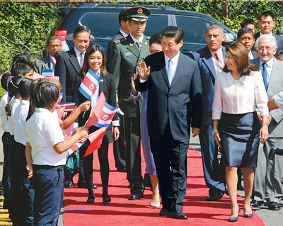 6月3日,哥斯达黎加总统钦奇利亚在总统府举行仪式,热烈欢迎国家主席习近平对哥斯达黎加进行国事访问。这是习近平主席在钦奇利亚总统陪同下向参加欢迎仪式的哥斯达黎加儿童挥手致意。 |