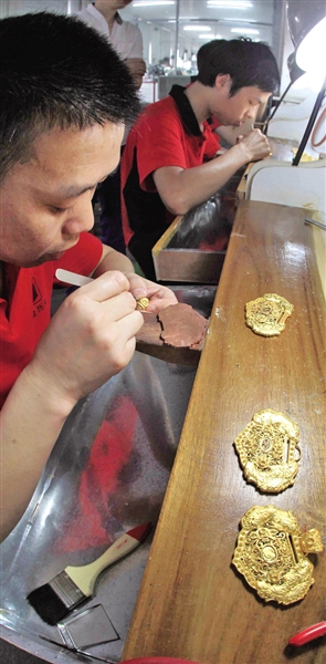 在金牛工贸公司的生产车间里,记者看到,很大一部分员工在做“花丝镶嵌”。“花丝镶嵌”是非物质文化遗产,将金银融成细丝,再用手工做出产品,一个花丝的产品要经过开料、摆花、焊接、执膜等6道工序,一个产品的完成要超过一个星期。叶亮向记者介绍道:“花丝产品的设计有的融合了中国传统文化,变身工艺品,这是其他一些公司做不到的。”说到此,叶亮不无得意。