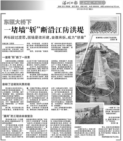 日前,本报“党报热线”88869996接到市民投诉,称东瓯大桥桥下的沿江防洪堤上有一堵围墙,去年年底工程结束后一直无人拆除,生生将防洪堤“拦腰斩断”。本报记者现场核实后发现,除了围墙挡道问题,围墙西侧一段本应是防洪堤配套景观工程的地带,变成了“菜园”,沿路还堆起了垃圾。而记者向两段工程建设方了解情况时,双方都称围墙为对方所建,自己负责的工程均已完成,“漏网”工程不在负责范围内(详见本报6月4日第7版报道)。