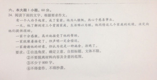 作文题目为要求考生围绕“中学时代,学生有三怕:一怕奥数,二怕英语,三怕周树人,但有些学生却喜欢前面的‘两怕’”阐述自己的观点,可以议论,也可以记叙,题目自拟。