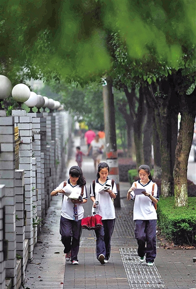 临阵磨枪,不亮也光。昨天上午,在温州中学考点外,考生边走边看书。苏巧将摄