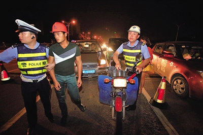 一名有酒驾嫌疑的摩托车驾驶员被交警带走。刘伟摄