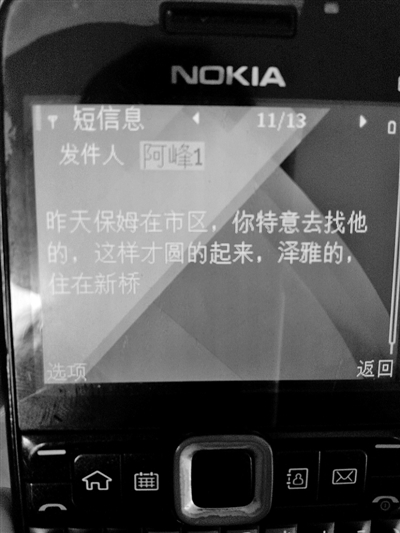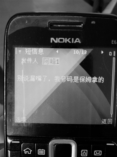 胡某也告诉记者,自己也收到姓厉的工作人员类似短信。记者在其手机里看到三条名为“阿锋1”(即厉姓工作人员。编者注)的短信:“兄弟,见主任前我们碰下,你几点去?我们交流下信息。” “昨天保姆(指医院护工。编者注)在市区,你特意去找他的,这样才圆得起来,泽雅的,住在新桥。”“别说漏嘴了,我号码是保姆拿的。”