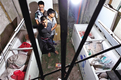 随后,周某被民警带往离娄西街51号不远处小巷中的冷库,里面储存了200多箱冷冻熟食品,包括扁平状鸡翅、鸭腿、鸭脖、鸭头等。此外,还堆放了160多个塑料编织袋,袋内装着大量的半成品,每袋重达100多斤。