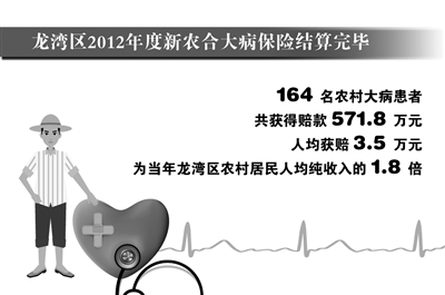 日前,浙江省温州市龙湾区2012年度新农合大病保险结算完毕,164名农村大病患者共获得赔款571.8万元,人均获赔3.5万元,为当年龙湾区农村居民人均纯收入的1.8倍。新农合大病保险更大程度上减轻了农村大病患者的医疗负担。