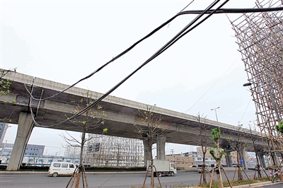 现场记录:沿着瓯海大道辅道行驶,从高翔段开始一路向东,沿途发现高架桥上飞挂下不少管线。特别在瓯海大道高架桥和部分引桥之间,空中管线横拉,看上去很凌乱。市城管与执法局的工作人员介绍,这些横七竖八的“蜘蛛网”不但有损瓯海大道的形象,而且存在很多安全隐患。