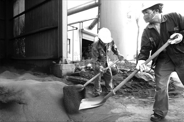 昨天,龙湾蓝田工业区,中环正源水务公司污泥处理厂内,几名工人正在清理经半干化焚烧污泥处理生产线处理后的“灰渣”。钱鹏鹤/摄