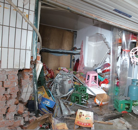 记者现场看到,7幢106室沿街店面门柱被撞毁了一半,店面隔壁的仓库一片狼藉,门口几箱啤酒瓶因撞击被震碎,门外的空调外机也撞入了房中,一张双层铁床移位了20余厘米。肇事车进口现代越野车停在三岔路口上,车子的前部车盖掀起,车后部的车灯掉落,保险杠凹陷。