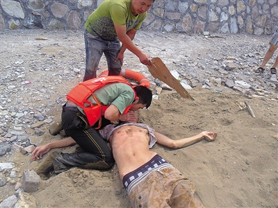 礁石边漂浮着白衣男子 官兵救人后人工呼吸