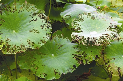九山公园二期内的荷叶半数被虫子咬得惨不忍睹。潘祝平摄